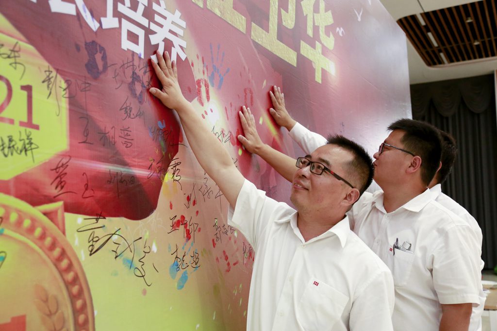 The team leaders and students left their palm prints on the signature wall where they promised to "learn advanced management knowledge and build a Weihua gold medal team". The colorful palm prints in the sky record the marks of their growth along the way.