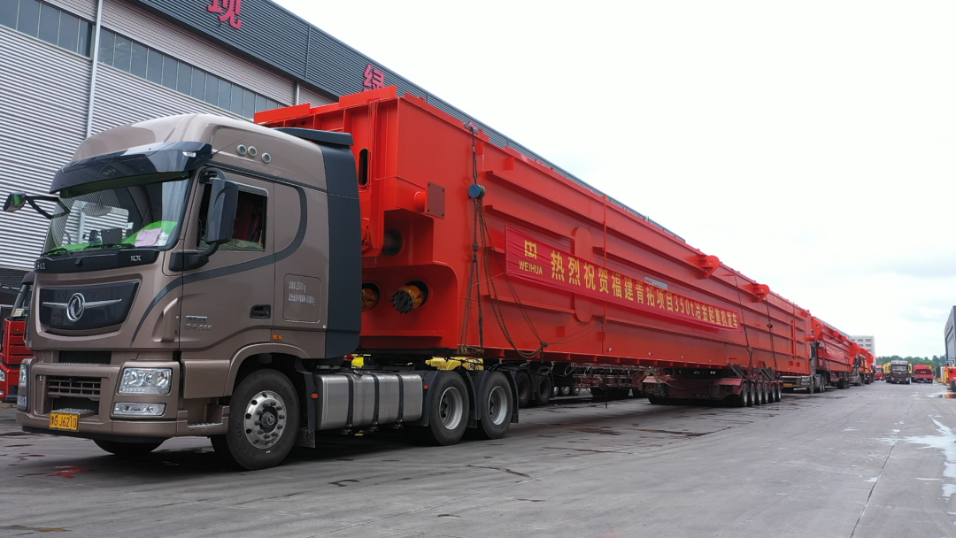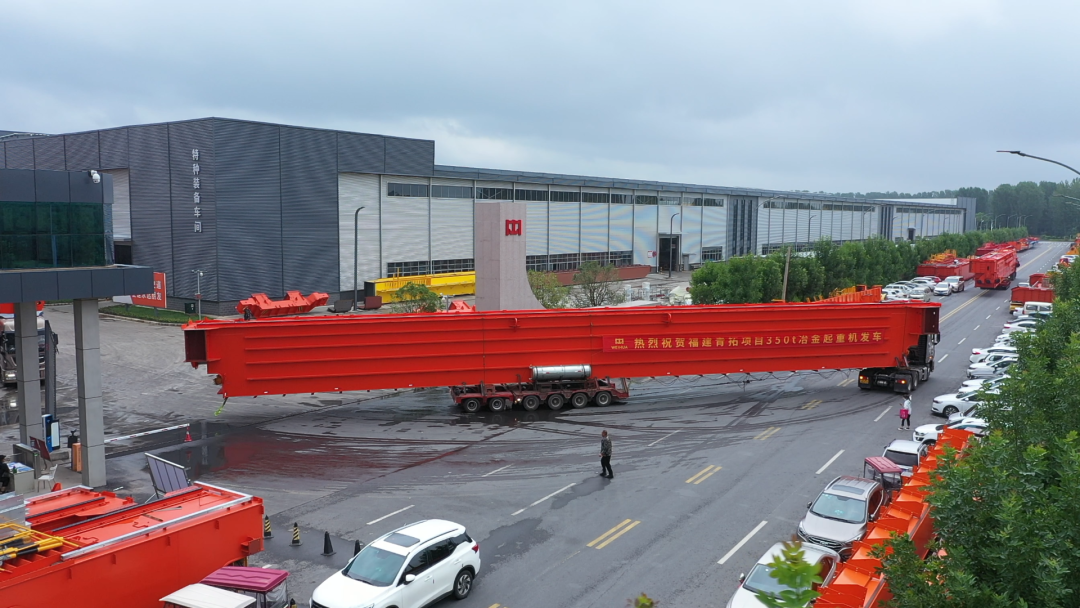 2. Departure - Fujian Qingtuo Project 350t metallurgical crane Departure On July 5, the first 350t metallurgical crane in the Weihua Fujian Qingtuo project was officially launched. Nine large transport vehicles loaded with huge casting bridge cranes and their accessories drove out of the Weihua Intelligent Industrial Park and headed towards the customer's project site.