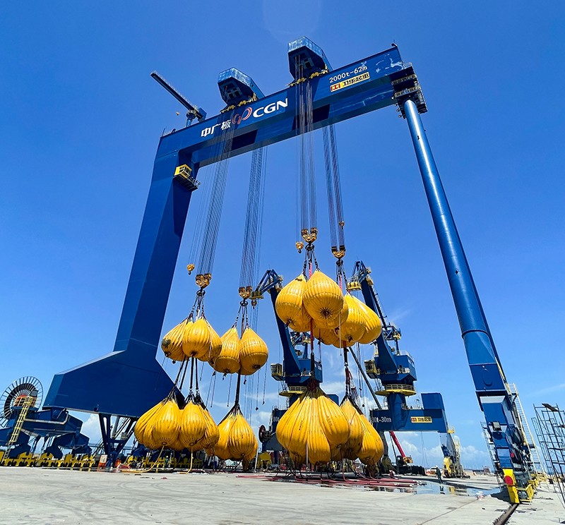 For the special working conditions and requirements of offshore wind power equipmentTo meet the demand, the 2000t rail-mounted gantry crane adopts four lifting point synchronous lifting technology to ensure the synchronous operation of each lifting point. It is also equipped with an industry-leading crane management and safety monitoring 5G data information management system, which can realize overall data statistics, real-time monitoring of product working conditions, historical data query, rapid repair of product faults, predictive maintenance of equipment and other functions.