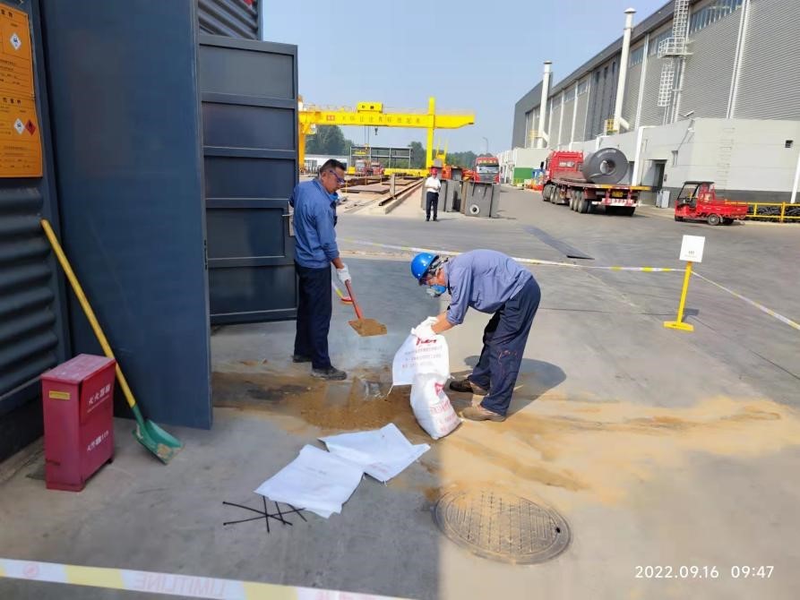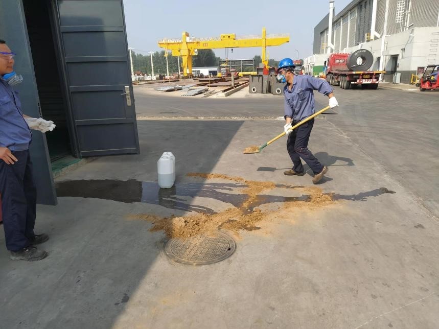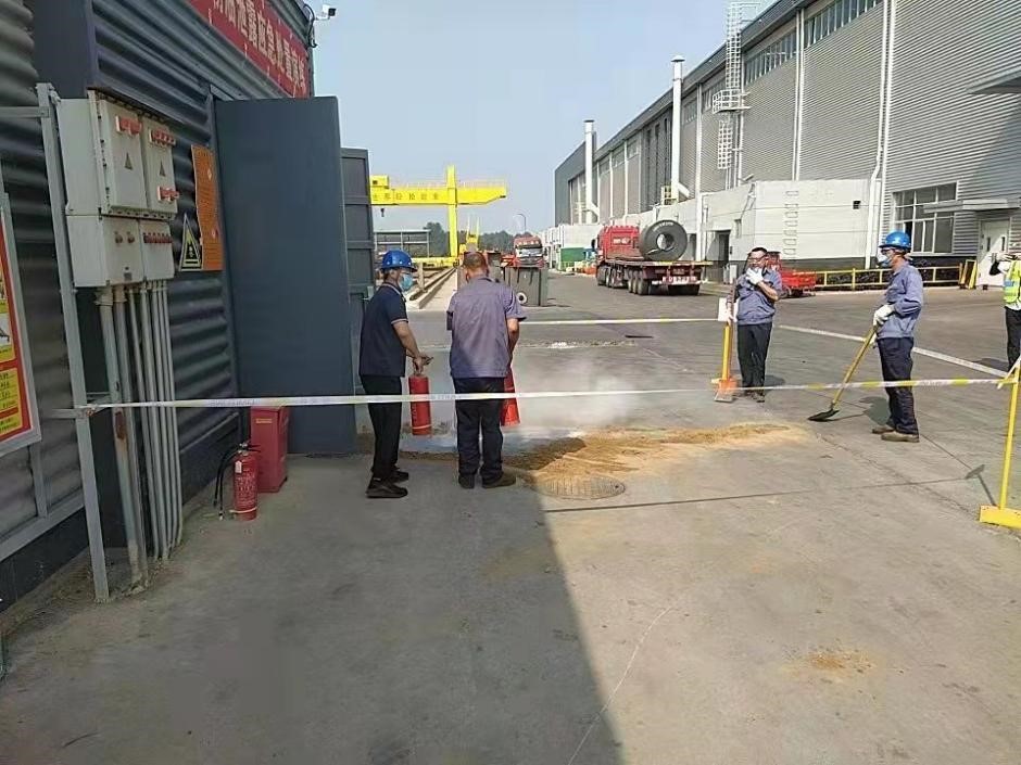 During the drill, when the machine shop used a forklift to transport waste mineral oil to the hazardous waste warehouse, the oil barrel holding the waste mineral oil tipped over, causing the waste oil to leak to the ground. The operator immediately called and reported the on-site situation to the company's emergency headquarters in accordance with the "Emergency Plan for Environmental Incidents" process.